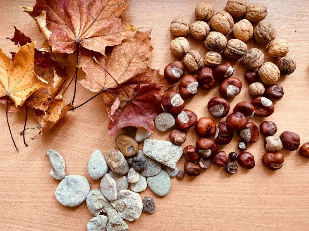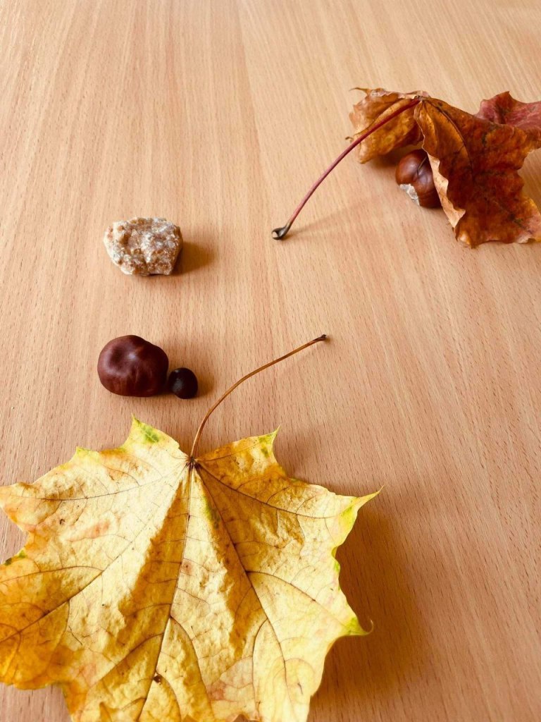 Jak to zwykle bywa przypadek nie był przypadkiem. Zbierając się rano, żeby wyjść na ustawienie indywidualne, nie mogłam znaleźć przygotowanych przeze mnie figurek. Ponieważ miałam mało czasu, chwyciłam słoik z kamieniami. W pracy okazało się, że są jeszcze liście i kasztany. Tym sposobem uzbierałam reprezentantów w jesiennej odsłonie i muszę przyznać, że praca na tych darach natury była bardzo owocna, przyjemna i cudownie wpisało się wszystko w tematykę ustawienia Po powrocie do domu, okazało się, że figurki były zupełnie na wierzchu i kilka razy je mijałam